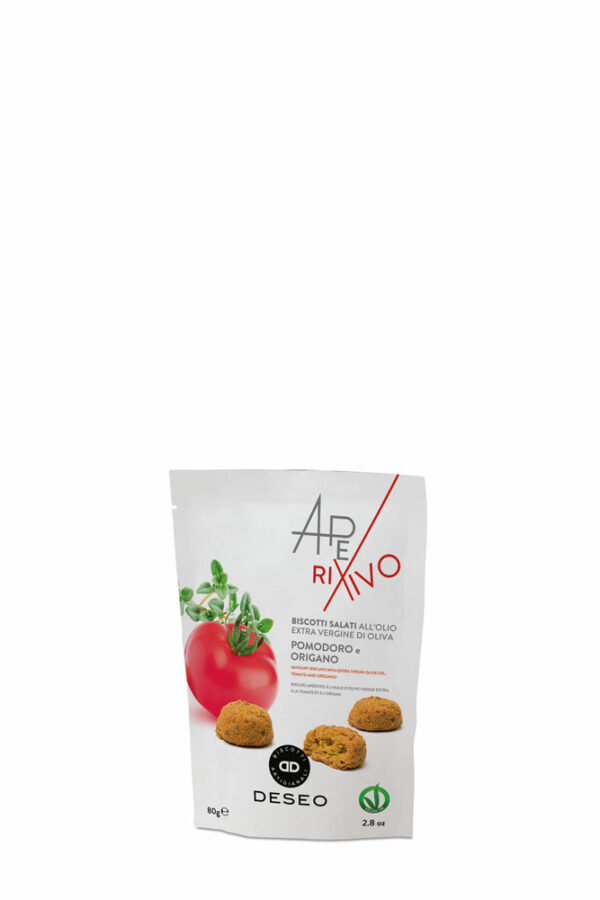 Kleine herzhafte Aperitif-Kekse hergestellt mit extra nativem Olivenöl. Perfekt geeignet zu Anti-Pasti oder zu einem Glas Wein oder Prosecco. Herrlich knusprig und verfeinert mit Tomate und Oregano.