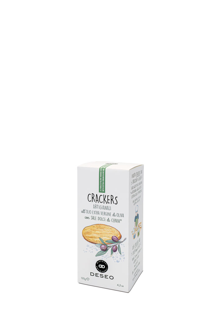 Die Cracker von DESEO mit Meersalz aus Cervia überzeugen durch ihre Knusprigkeit. Ein Ergebnis der handwerklichen Herstellung und des schonenden Backens bei niedriger Temperatur. Sie sind ideal für den schnellen Genuss zwischendurch und eignen sich hervorragend als Aperitifbegleitung. Besonders gut schmecken sie mit Ricotta, frischem Ziegenkäse, Salami oder einem Kichererbsen-Aufstrich.