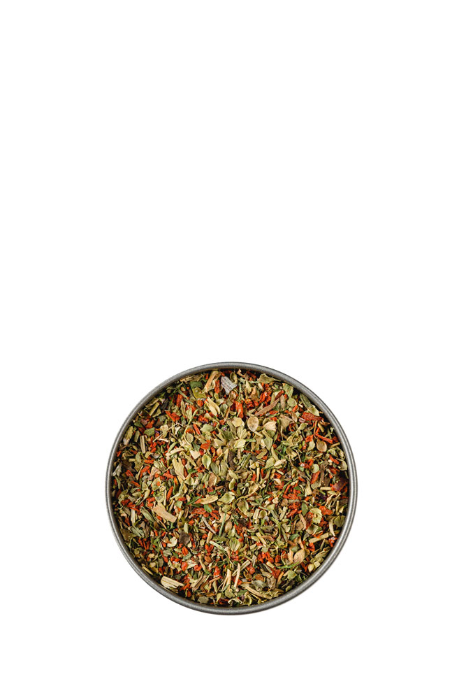 Tomatenflocken, Basilikum, Oregano, Knoblauch, Petersilie, Salz, Thymian, Rosmarin, Chili.