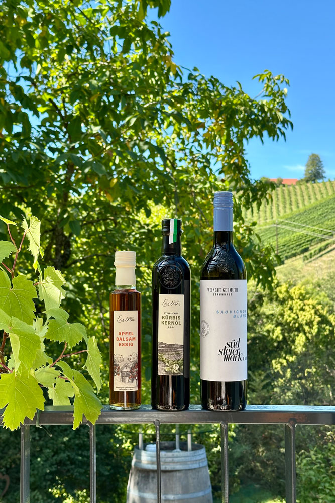 Dieses Bundle besteht aus 1 x 0,50l Steirisches Kürbiskernöl g.g.A. und 1 x 0,25l Apfelbalsam Essig, 1 x 0,75l Sauvignon Blanc